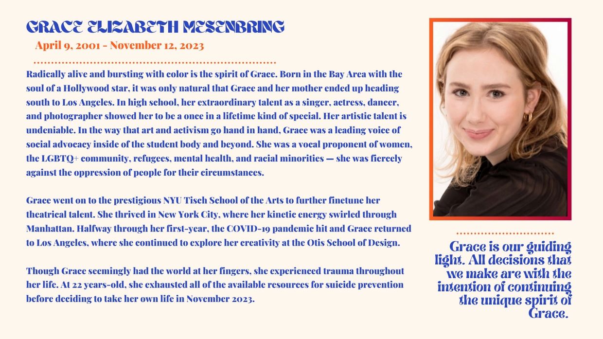 At Grace's Light, we are committed to helping young people heal and transform trauma into a meaningful life through the arts. Our mission is inspired by Grace Elizabeth Mesenbring, focusing on community engagement, personal growth & expression through the arts.